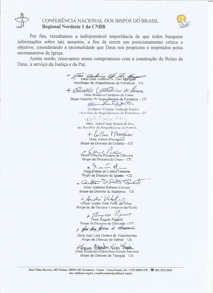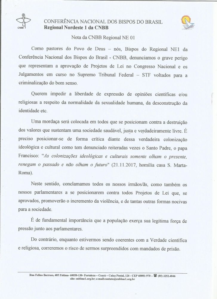 NOTA DA CNBB REGIONAL NE 1