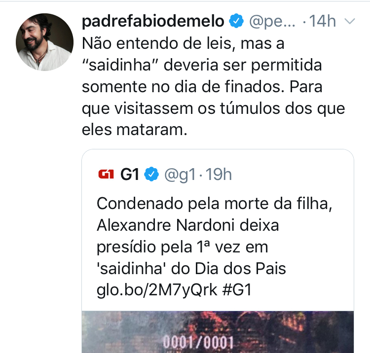 O mais recente tema do mimimi que povoa as redes sociais brasileiras são as críticas do Padre Fábio de Melo a “saidinha” de Alexandre Nardoni da prisão para comemorar o dia dos pais. Logo Nardoni que matou a própria filha! O assunto é 100% polêmico. Afinal, deve a Justiça liberar um pai que matou a filha para comemorar o dia dos pais em casa? Isso é justo? Mas se está previsto em Lei, negar o benefício seria correto? Que País faz Leis assim? Bom, já vimos que rende debate, mas qual o problema de um padre pensar assim? Bom, hoje em dia tudo é motivo pra detonar o embate político.