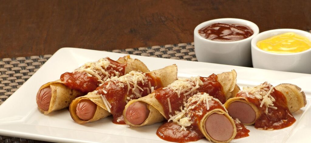 7. Recheie os crepes com salsicha.
