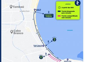 Percurso – Na corrida de 5km, a atividade esportiva inicia no Largo do Busto de Tamandaré, seguindo pela Avenida Cabo Branco até as proximidades da Fundação Casa de José Américo, onde será o ponto de retorno e seguindo até o Largo do Busto de Tamandaré, onde encerra o percurso da corrida.
