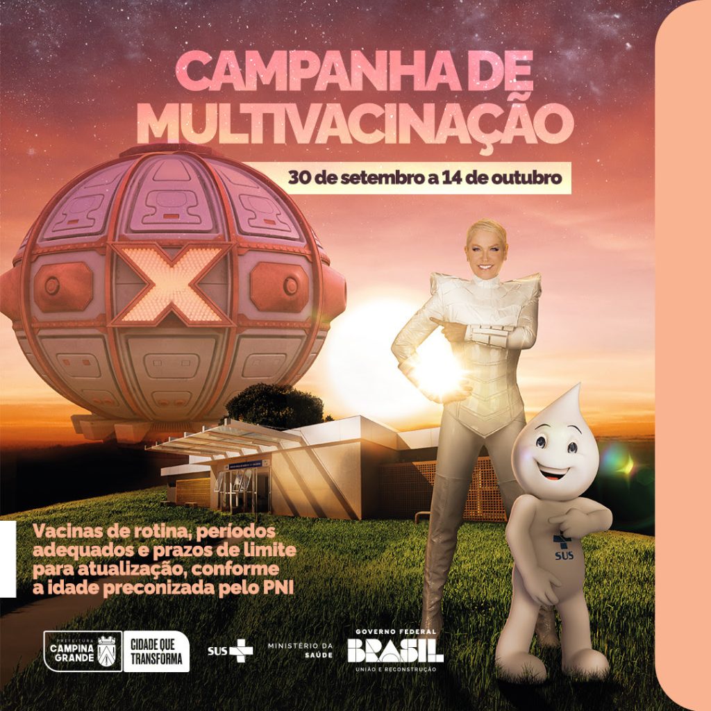 Neste sábado, 30, começa a Campanha Nacional de Multivacinação, que vai até o dia 14 de outubro. Em Campina Grande, a abertura acontece no Parque da Criança, a partir das 8h. O movimento, este ano, tem como personagens centrais a Xuxa e o Zé Gotinha, na sensibilização aos pais para imunizarem e protegerem seus filhos.