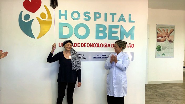 Após terminar a última sessão de quimioterapia, de um tratamento que combinou quatro ciclos de terapia vermelhas e doze aplicações de quimioterapia branca, que começou no dia 11 de março deste ano, além de uma cirurgia, Dona Maria foi carinhosamente homenageada pelos funcionários do Hospital do Bem e pôde tocar um sino, estrategicamente colocado na recepção da unidade, que simboliza com seu som a vitória e a superação da vida sobre a morte. A médica oncologista Nayarah Castro, que acompanhou a paciente, e a diretora geral do Complexo Hospitalar Regional Dep. Janduhy Carneiro de Patos (CHRDJC), Liliane Sena, do qual o Hospital do Bem faz parte, leram mensagens e a oração do Santo Peregrino de Folí, patrono dos doentes de câncer.