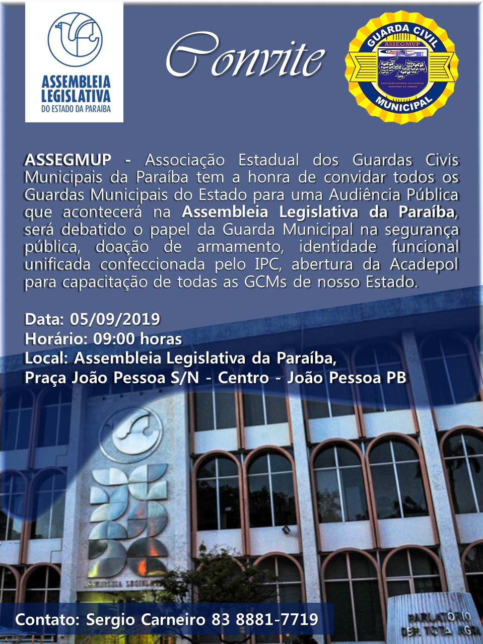 A audiência foi requerida pela Associação Estadual dos Guardas Municipais da Paraíba e a propositura foi da deputa estadual Estela Bezerra (PSB).