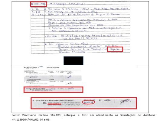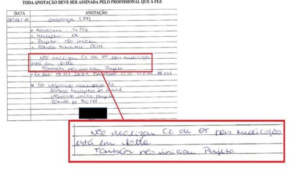 O documento retrata evidências de atrasos e interrupções sem justificativa no tratamento contra o câncer em 21 de 23 prontuários de pacientes atendidos no local. Em uma das situações, uma paciente recebeu prescrição para iniciar tratamento com Pertuzumabe em setembro de 2020. No entanto, ela só tomou a primeira dose da medicação em março de 2021.