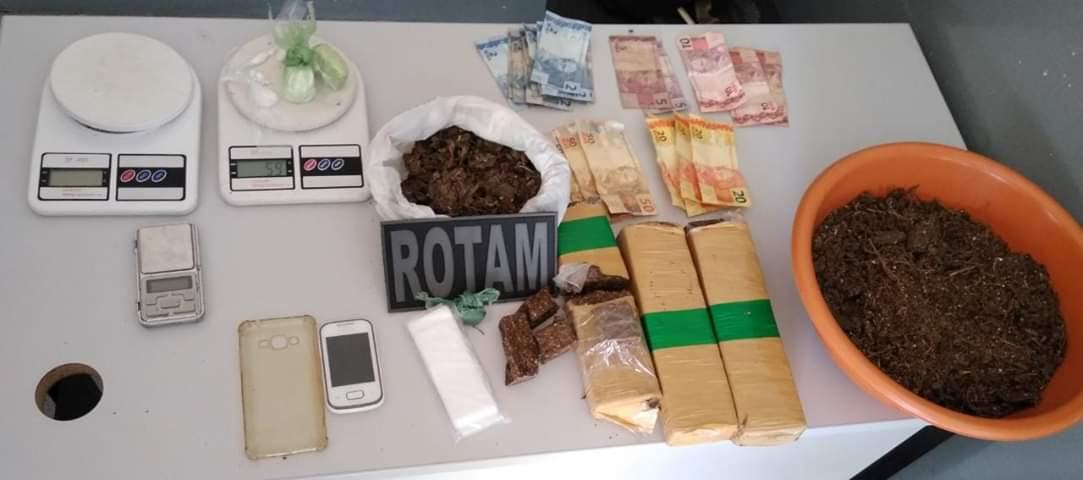 A jovem ao perceber a presença da PM, tentou fechar a casa que servia como ponto de venda de drogas. Na residência foram encontrados 3 kg de maconha, 59 gramas de cocaína, três balanças de precisão, embalagens e uma quantia em dinheiro.