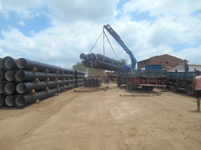 Tubos sendo descarregados no início da obra (Secom/PB)