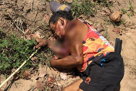 Agora o mesmo foi encontrado morto em um terreno com marca de facãozada no braço esquerdo e tinha marca pelo corpo provavelmente de tiros.