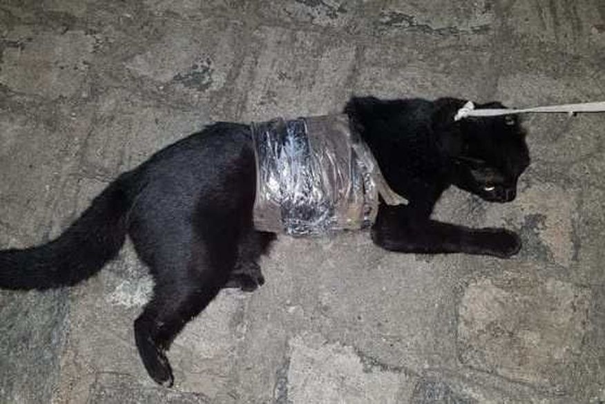 Com o gato foi encontrado 120 gramas de substância semelhante à maconha e cinco cabos de carregador de celular, que estavam amarrados por fita ao redor do seu corpo.