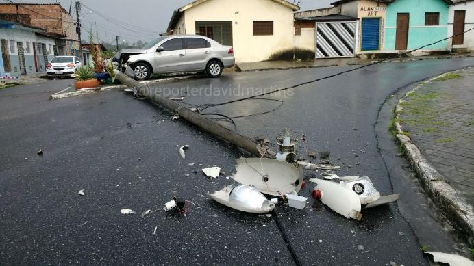 Um carro bateu em um poste no final da noite desta terça-feira (08) e na manhã de quarta, o poste que caiu ainda estava no meio da rua.