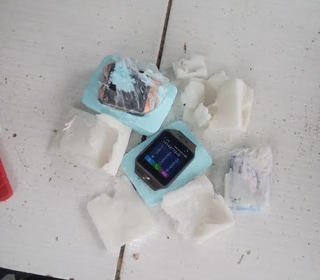 De acordo com a direção da unidade prisional, as suspeitas haviam tentado levar três aparelhos telefônicos-relógios escondidos em peças de sabonetes e maconha que estava no interior de uma embalagem de creme dental.