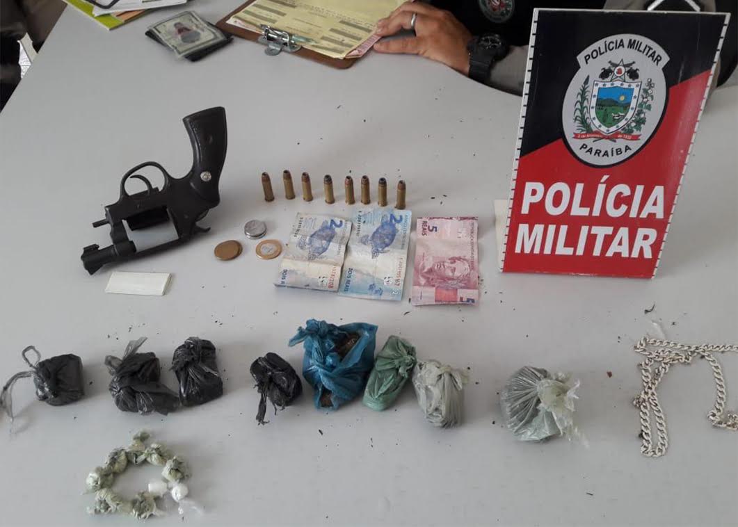 Policiais militares da 1ª Companhia Independente (1ª CIPM) estavam em atividades preventivas na comunidade Papo do Sapo, no Conde, quando se depararam com um grupo que estava armado e com drogas. Na abordagem, quatro pessoas foram detidas, sendo um adolescente. Com eles, a PM encontrou um revólver calibre .38, munições e 16 trouxas com maconha e cocaína.
