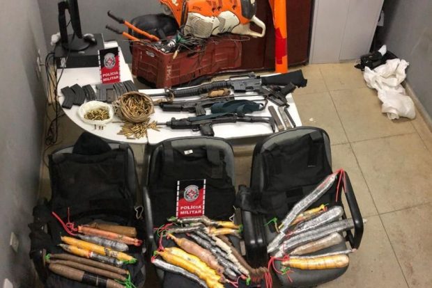 Até agora, foram apreendidas vinte e cinco bananas de dinamite, fuzil, duas submetralhadoras, pistola, carregadores, quase seiscentas munições de armas de grosso calibre, várias espoletas, cinco coletes balísticos, touca ninja, lanternas de cabeça, motosserra, lixadeiras, alicate grande, discos de corte, um rádio comunicador e outros materiais usados por quadrilhas que atacam bancos.