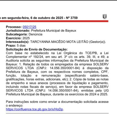 O Tribunal de Contas do Estado da Paraíba (TCE-PB) intimou a prefeita da cidade de Bayeux, Tacyana Leitão, para apresentar documentos referentes a um contrato no valor de R$ 16.416.854,64, para prestação de mão de obra do tipo auxiliar administrativo educacional, zelador, analista administrativo e assistente operacional no âmbito da Secretaria de Educação.
